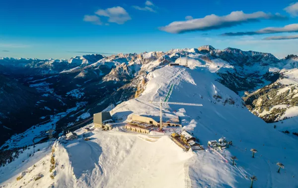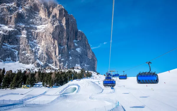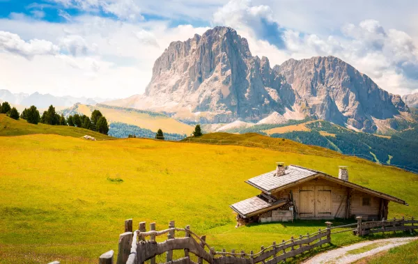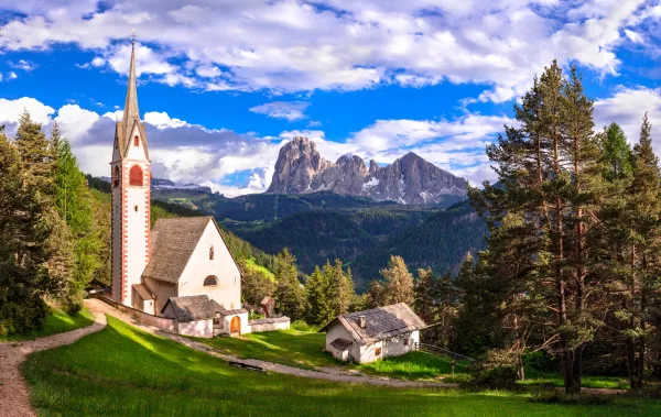 You’ll then descend into the heart of Val di Fassa, a pristine alpine valley steeped in Ladin traditions and dramatic beauty. Winding roads lead to Passo Sella, a mountain pass at 2,240 meters above sea level, offering unmatched views of the Sella Group and Sassolungo, two of the most monumental formations in the Dolomites. Weather permitting, there will be time to stretch your legs and enjoy the crisp mountain air—or even take a ride on one of the panoramic cable cars (optional, not included), ascending to viewing platforms high above the valley floor.