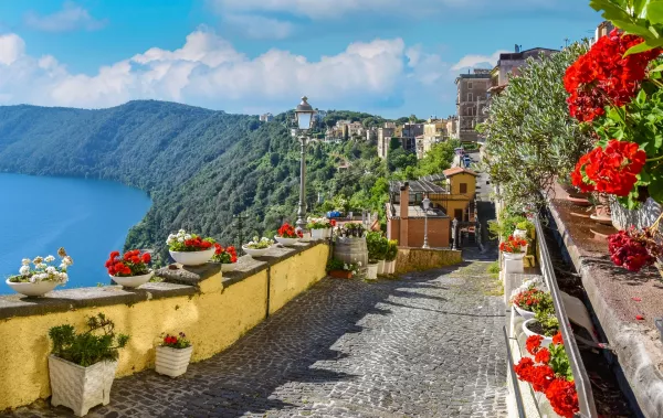 Located just outside Rome, Castel Gandolfo lies on the edge of Lake Albano. Its palace is notable as the summer residence of the popes since 1623, featuring a magnificent terraced park and the former Villa Barberini, built on the ruins of a villa of the Roman emperor Domitian. Precious marble, brocades, and splendid tapestries display the true opulence of the Baroque era.