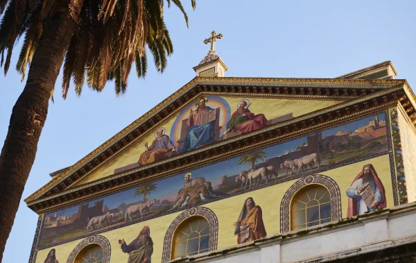 The Basilica of Saint Paul outside the Walls testifies the history of the Holy Church in Rome. The main altar, surmounted by a stunning Gothic canopy, treasures the mortal remains of St Paul, who was buried here. The giant basilica was built as early as the V century AD and features original Roman columns, a great mosaic from the Middle Age, but also the portraits of all the Popes in history, including the last ones: Pope Francis and Pope Benedict XVI.