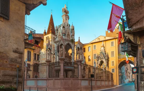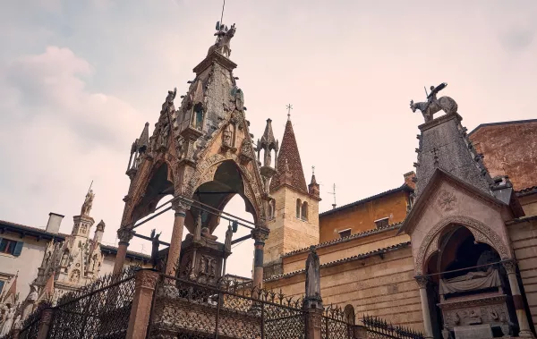 The Arche Scaligere are a set of elaborate Gothic funerary monuments in Verona, built for the powerful Scaliger family. These striking tombs, adorned with intricate sculptures and towering canopies, reflect the grandeur and influence of Verona’s medieval rulers.