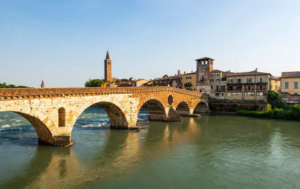 Verona's Ponte Pietra, meaning "Stone Bridge," is a picturesque and historic arch bridge that spans the Adige River. Dating back to Roman times, its construction began in 100 B.C. and has undergone restoration and modifications throughout the centuries. The bridge features a series of arches and is notable for its asymmetrical design. With its stone structure and commanding views of Verona's old town, Ponte Pietra stands as an architectural testament to the city's rich history, offering a charming and timeless crossing over the flowing waters of the Adige.